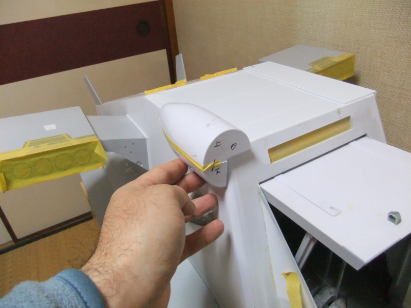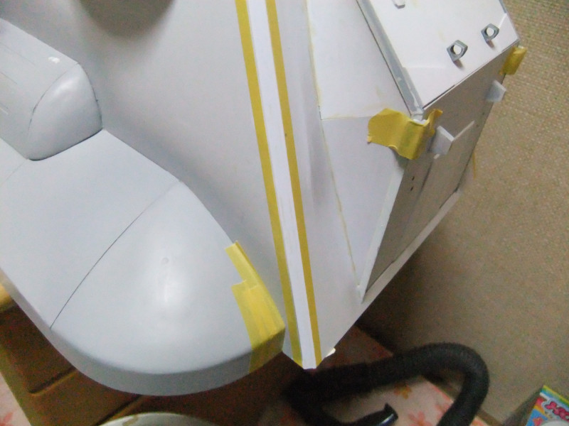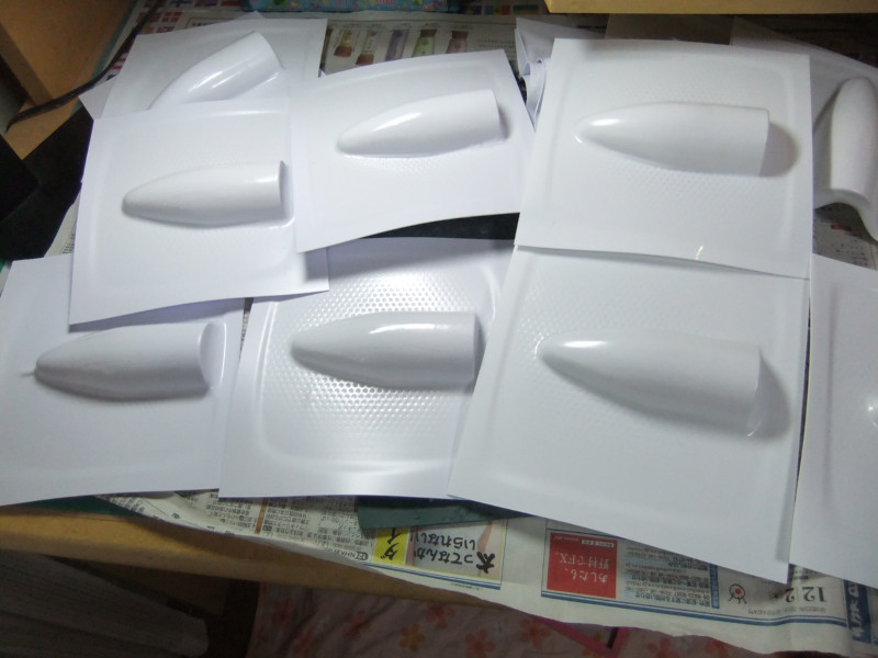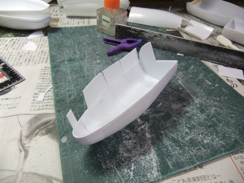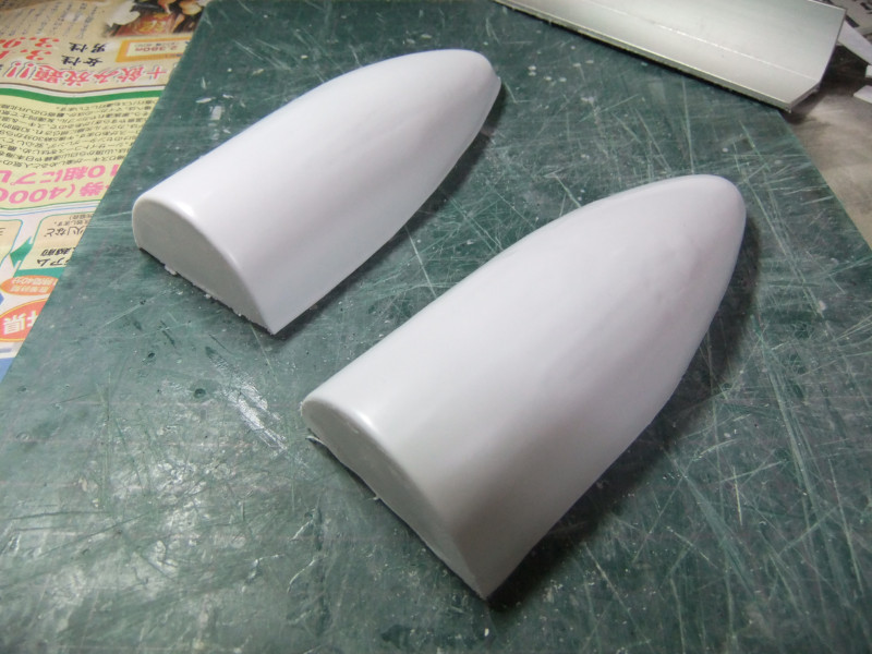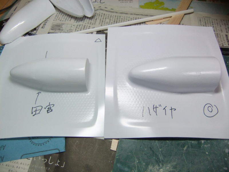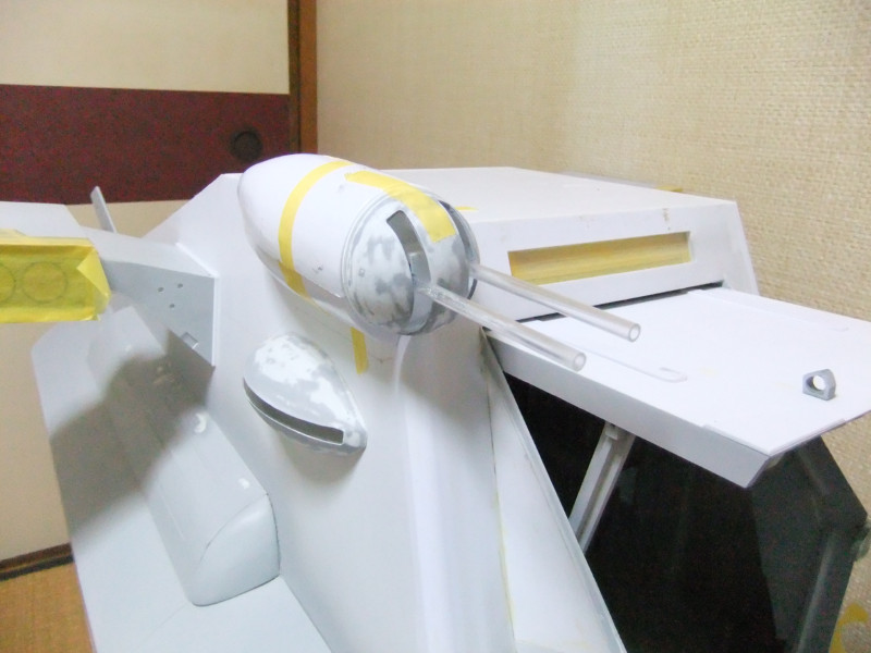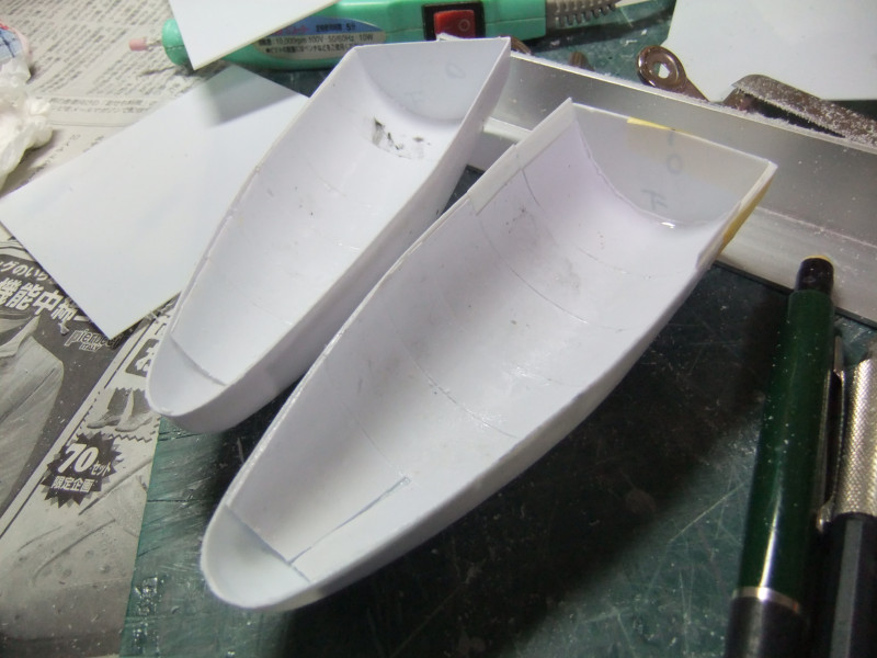 × [PR]上記の広告は3ヶ月以上新規記事投稿のないブログに表示されています。新しい記事を書く事で広告が消えます。 ギャロップの製作ですが、年末年始の休みの間に大分進むかと思いきや 買い物に行ったり、自分や嫁の実家に行ったり、録画したビデオを見たりと 意外と時間がとれず、思ったより進みませんでした。 相変わらず、機関砲基部の製作です。 まず上下に分割してあるパーツを合体させねばなりません。 これは上下のパーツをテープで仮止めしてみたところ。 ほぼ、ぴったり合っています。 同一の型からバキュームフォームした物なので、ぴったり合うはずですが 物によっては微妙に合わないという不思議。 まぁバキュームフォームの際の「すそ」の広がり方等が違うんでしょう。 そのままギャロップ本体に仮に置いてみました。 ギャロップ本体側面の角度に合うように、おおざっぱな調整はしていますが まだぴったり合うとまではいきません。 基部のパーツの裏に0.5mmプラ板を貼って「のりしろ」を確保します。 裏から見たところ 上下を貼りあわせてからさらに補強して、ギャロップ本体の角度に合わせて整形しました。 これが右側で、現在左側にとりかかっています。 PR 先週バキュームフォームで作った、ギャロップの機関砲基部ですが 原型の高さを増したせいなのか、プラが薄くなってしまったので補強する事にしました。 写真の右側がバキュームフォームに失敗した物ですが、これをぶった切って補強に使用します。 右側を輪切りにして、左側の裏側に接着していきます。 本来、同じ原型から作製した物なので、全く同じ大きさになるわけですが これをそのまま二枚重ねても隙間が出来て接着できません。 いくつかに切断する事によって、プラの柔軟性のおかげで接着・補強が出来ます。 こうやって補強して、プラの厚みを増しておかないと 後々、表面処理やスジ彫りの時なんかに穴があいてしまいそうで怖いんです。 機関砲と基部をテープで仮組みしてみたところ。 若干機関砲の砲身が長い気がします。いや、若干じゃなくて大分かな・・・。 しかし、この機関砲って内径3mmのプラパイプを使用しているんですが 1/100スケールに換算すると300mmなんですよね~ つまり30センチ砲という事になってしまいます。 でかい!30センチって機関砲じゃないじゃん! あの砲身の中には30mmガトリング砲が収まっているという事にして 真鍮パイプを円形状に仕込むとか・・・? うーん、めんどくさそう! まぁ、後で考えましょう。 それよりも、基部をギャロップ本体にどうやって接着するかが問題っぽいです。 先週から引き続き、ギャロップ機関砲基部のバキュームフォームのお話です。 先週作った原型はゲタを履かしていなかった為、すその部分が広がってしまっていました。 最初はその「すそ」の部分をプラ板で継ぎ足して作るつもりでしたが やはり原型の高さを稼いで、バキュームフォームをやり直す事にしました。 原型の底にバルサ材を瞬間接着剤で貼り付けて10mm高さをアップしました。 表面が黄色いのは、表面1mmくらいが光硬化パテの層になっているからです。 痛んでいた表面もペーパーがけして瞬間接着剤でコーティングしなおしました。 新しくなった原型を使用してバキュームフォームしたのがこの写真です。 思った通り、すそが広がるのが「継ぎ足した部分」に来たので成功です。 ちなみに、今回使用したプラ板はタミヤのやつとハザイヤのと両方使ったのですが 同じようにバキュームフォームしてもタミヤのプラ板の方が、プラの厚みを確保できるようです。 ハザイヤのプラ板は同じ1mm厚を使用しても、かなり薄くなっていて、ちょっと指で押すとへこみそうなくらいです。 原型を10mmかさ上げしたので余計に薄くなってるんだと思います。 切削性はハザイヤのプラ板の方が柔らかく削りやすかったのですが バキュームフォームに適しているのはタミヤのプラ板のようです。 バキュームフォーム後の厚みをきっちり確保できます。 今回はタミヤのプラ板の手持ちがほとんど無かったので、4枚作った内の3枚はハザイヤのプラ板を使用しています。 つまり3/4は厚みが薄くて、強度に不安があるという事。 補強は必須ですね。 1/100ギャロップの機関砲がくっついてる部分、何て呼べばいいか分かりません。 こういうブログをやってると呼び名が決まってないと不便です。 とりあえず機関砲基部と呼んでおきますが この部分のバキュームフォームを先週済ませました。 相変わらず、バキュームフォームは難しく、一発で納得のいく出来の物が出来上がった試しがありません。 そうすると、数撃ちゃ当たるでたくさん作ってその中から使える物を使うという方法をとる事になります。 この時も、最初は上手くいかなかったのが、何回もバキュームフォームを繰り返していると、コツを体が覚えてきて、最後の方はいい出来になりました。 その代わり何回もバキュームフォームを繰り返してい