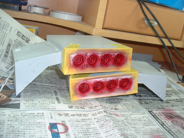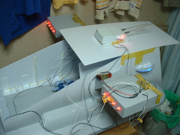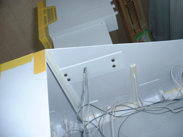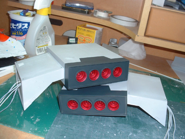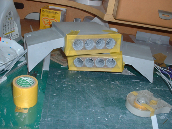 × [PR]上記の広告は3ヶ月以上新規記事投稿のないブログに表示されています。新しい記事を書く事で広告が消えます。 フルスクラッチギャロップですが、ふとLEDが本当に点灯するのか怪しくなりまして、というのも、ヤフオクで買った本来ラジコンを光らせる用のLEDを色々なところで切断しているので、ちゃんと線をつなげる事が出来るかが心配になって、ギャロップに組み込んでから初めて線を全部つないでみる事にしました。 一応切断した箇所にはテープを貼って「どの線と接続するか」というのをテープに書いてあるので、なんとか接続は出来ました。ちょっと間違ったりもしたけど・・・ で、9Vの角型電池を繋ぐとちゃんと点灯しました!一安心です。 でも青色のLEDが思ったより光が強くてモノアイみたいに見えますね・・・ これでも一応窓部分にはマスキングテープを貼ってあるんですがザクのモノアイみたいに見えます。 もう完全に接着しちゃってLEDも埋め込んであるんでやり直しきかないんですよねー サイドの窓はスモークで塗装しちゃおっかなぁ・・・ しかしLEDの光量ってのはすごいですね 塗装してないプラなんて余裕で透過しちゃってます。 サーフェーサーも必須っぽいです。 あと、最近の作業としてはギャロップの内部、格納庫部分を作りこんでいってます。 こういう部分って凝りだすときりがないっていうのが分かりました。 ネットで色々艦船なんかの格納庫などを参考にしながら作ってるんですが MSに搭乗するためにはMSのハッチまで伸縮式の通路が必要じゃないかとか、人間が通る通路も壁から張り出しているんだろうとか、武器を置いておくラックみたいなのもいるかなぁ、あとクレーンも必要かなとか、色々と作らないといけない小物が増えます。 でも完成後には見えなくなる部分もあるんですけどねぇ・・・ しかし、左右の機関砲のふくらみ、どうやって作るかそろそろ考えとかないとヤバイです・・・ 今日はギャロップの本体とエンジン部分を接続しました。 接着剤とタッピングビスを使ってくっつけてあります。 当初は接着剤だけでも大丈夫だろうと考えてたんですが、荷重のかかる所だけに、タッピングビスも併用して強度を確保しました。 でもエンジン部分とボディの間がぴったりと密着せず、隙間があいてしまいました。 これはある程度予想していたのですが、予想以上に隙間があきました。 なぜ隙間が出来るかというと・・・ ボディ側のプラ板がたわんでいて、平面になっていないからなんです。 支えている骨組みやスカート、床・・・色々な部品がボディ側面のプラ板に接着されてつながっていますが、どの部品も設計どおりの寸法通りの寸法になっているわけではありません。 寸法通りにカットしたつもりでも必ず0.数ミリ誤差は出ます。 つまり、この場合、ギャロップの側面のプラ板は内側から骨組みのプラ板、プラ棒で接着し、支えてありますが、この骨組みが全て寸分たがわず同じ角度で接着されてないと、支えているギャロップの側面にゆがみが発生するんです。多分。 あと、スカート部分の骨組みも接着されているので、そちらの誤差も歪みの原因となりそうです。 まぁこれだけ大きいサイズだとしょうがない部分だと思います。 加えてギャロップに使用しているプラ板は1mm厚(骨組みの一部は2mm)ですが、厚みに比べて面積がかなり大きいのでペラペラの紙のような感じで、歪みやたわみが発生しやすいと思われます。 これから屋根をつけたりハッチをつけたりすると、また何らかのゆがみが発生すると思います。 逆に、プラ板が1mmで、ゆがんだり、たわんだりしてくれるおかげで、少しの誤差くらいなら吸収出来るという利点もあります。 そう言えば タッピングビスの下穴を開ける作業と、ビスを締める作業に電動ドライバー兼ドリルを使用したんですが、使おうとして、ケースから取り出すと油漏れが・・・。 ただ置いてあっただけなのに電動ドライバー内部から油がにじんでました。 さすがコーナンの安物です。そのうち内部の油が全部流出して焼きついたりしそうです。 電動ドライバーとか使うとなんか日曜大工でもしてる気分になります。 かなり久しぶりの更新です。 1/100ギャロップ、ちょっとずつ作業は進んでいます。一応・・・ 先日エンジン部分をマスキングして色を塗りました。 まだまだ製作しないといけない部分はたくさんあるのですが エンジン部分は本体に接着してしまうとマスキング等の細かい作業が非常にやりにくいので 先に塗れる所は塗ってしまってから本体に接着するというわけです。 一番上の写真がマスキング完了時の写真です。 これはエンジンの後ろ側のノズルじゃなくて、前から見たところで、 ノズルのように見えるのは一応空気吸入口です。 この丸い吸入口の周りを練り消しでマスキングしてから、マスキングテープで周りを覆います。 そして吸入口を赤く塗ったのが真ん中の写真。 次に逆に吸入口を練り消しで