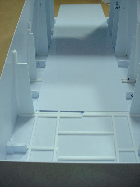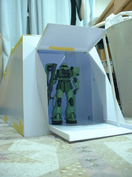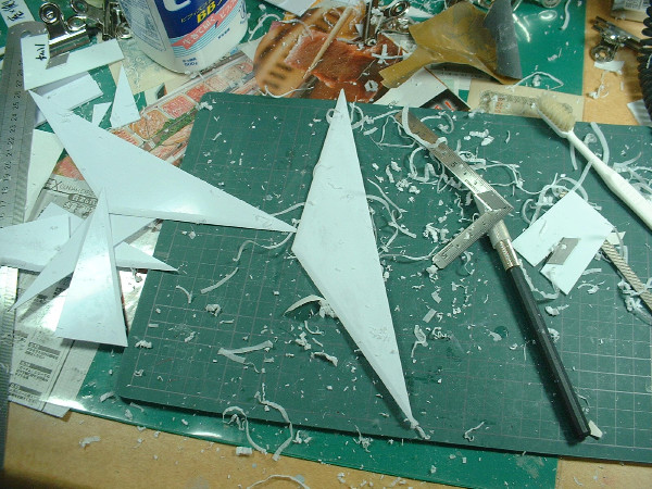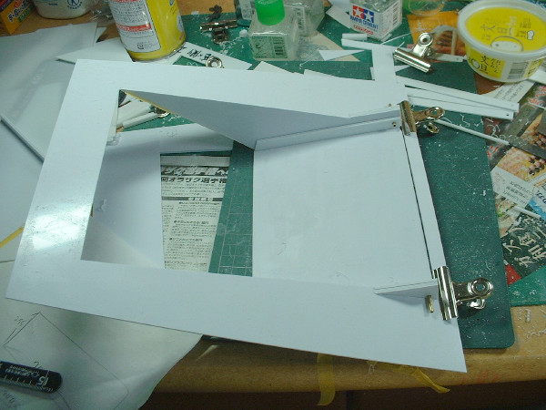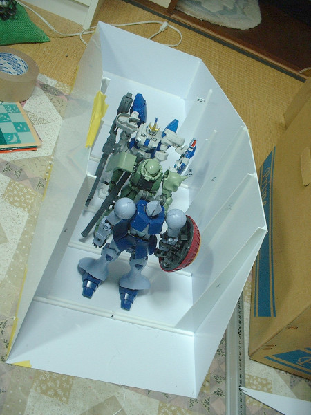 × [PR]上記の広告は3ヶ月以上新規記事投稿のないブログに表示されています。新しい記事を書く事で広告が消えます。 今日のフルスクラッチギャロップは プラ板を削る作業のみで終わってしまった。 昼間は美容院に行き、パン屋に寄り、 ホームセンターとミドリ電化でLEDやらプラ棒などを購入。 そんなこんなで日中は作業できず。 夜に作業を開始したが、 ハッチ部分の部品の小口を、ひたすら削るのみ! プラ板にカッターの刃を貼り付けた物で プラ板の断面を削って角度をつけていく。 そうすると、写真のような削りカスが大量に発生する。 で、その削りカスは静電気によって服にくっついて離れないのだ。 服だけじゃなくて、手とか顔にもくっつくのでうっとおしい! このギャロップはでかいので、各パーツの小口を削る作業も かなりの作業量になり、今まで何度も繰り返してきた作業だが、 やっていて面白い作業ではない。 やはり、表面にディテールを接着するとか、プラ板の箱組みを組んでいくとか、 そういう作業の方がやっていて面白いのだ。 そういえば、ギャロップの絵を見ようと オリジンのコミックを読み返していたら、 初期型ギャロップ?が描かれていた。 ルウム戦役後にガルマがコロニー内の戦闘でギャロップに乗って 指揮をとっているのだが、よく見るとギャロップには 両サイドのエンジンが無いのだ。 多分、地球で使ったギャロップの原型だろうけど、 推進力は何なのだろう? ギャロップの底を、プラ板、格子状に貼ったプラ棒、プラ板のサンドイッチ構造にして、強度をかせごうと作業中。 昨日、プラ棒を貼る作業が終わった。今日はその上に貼る予定のプラ板を切り出して終わり。 あと、ハッチの幅が狭く感じたので、CAD図面上でちょっと広げた。 ザクでぎりぎり、グフは肩のスパイクがひっかかりそう、ドムは完全にひっかかりそう、な感じだったので・・・。 ところで、製作中も、色々と問題点というか、気付いた点がいくつか出てきたので列挙してみる。 1.全長80センチオーバー、全幅70センチオーバーにもなる予定だが、 これをヤフオクに出品するとして、梱包するダンボールのサイズはあるのだろうか? エンジン部分を脱着式にした方がいいかなー。 2.中にMSを入れて、中で倒れてしまうと、ハッチ部分から手を入れて、それを立たせたり、 外に引っ張り出したりするのは苦労しそうなので、天井を外せるようにした方が良さそう。 3.ハッチから中が見えるし、天井外すと内部が丸見えなので、 それなりの格納庫っぽいディテールが必要。 4.内部の筋彫りとか、塗装とか、先にやっとかないと、後で出来ない所が出てきそう・・・。 5.サイズに余裕があるので、電池とLED積んで、電飾しちゃおうかな 6.ハッチ開閉ギミック、半球状の機関砲基部、曲線で構成されたスカート部分・・・どうしよう? 今日はチマチマとプラ棒でギャロップの壁と床を補強していた。 あとはプラ板の切り出し。 作業が終わった後に、ギャロップにMSが三機搭載可能かどうか、実際に試してみた。 MGザクver2.0、MGギャン、1/100トールギス3の三機をギャロップの中に入れてみた。 なぜ、この三機かというと、手元にあるMSがこの三機しかないからにすぎない。完成品はたいがい、オークションで売ってしまうので、組んで、色も塗ってないザクとギャンと、オークションで売れなかったトールギス3が手元に残っていたというわけ。 あと、ボールもあったっけ。 写真を見ると分かるように、無事に三機搭載できた。 大型MSで知られる、ギャンもちゃんと載るので安心。 これなら、ランバラル隊に配備されるはずだったドムも載るだろう。 ちなみに、ギャンにビームサーベルを構えさせたら、ギャロップからサーベルがはみだしていた。 でも、ギャロップにギャンという組み合わせも意外と合うかも・・・ |