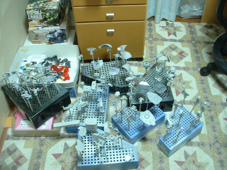 これで臭くなくて、水で洗えたら最高なのに。 で、昨日もエアブラシで一つパーツを塗ってたら、吹き始めにやたらと塗料が飛び散る。 いっこうにそれが収まらないので、エアブラシを分解、清掃する事にした。 先っちょだけを外して清掃はしてたが、今回は分解出来る所は全部分解して、ラッカー薄め液の強力な洗浄力を利用してとことん洗う事にした。 先っちょのノズルキャップに薄め液でも取れない硬い塗料の固まりがあったのでそれを爪楊枝でこそぎとる。塗料ノズルにも汚れがあったのでそれも拭き取って、もう一度組み立てて試し吹きをしてみたが、症状は変わらない。なんで? 今度はニードルを初めて外して(クレオスの説明書にはなぜか外すなって書いてある)みるとニードルの真中あたりに塗料汚れが固着していたのでこれも拭き取った。 で、さらに良く見るとニードルの先っぽがわずかに曲がっているような気が・・・。 例えるなら、針の先に髪の毛の先くらいの細い短い針がさらについていてそれがわずかに曲がってる感じ。曲がってるというよりバリがついてるような感じ。 ここで、「ニードルが曲がったら終わり」という言葉が頭をもたげた。指先でニードルの先のバリをこそいでみる。すると見た目にはバリのような物は取れたような気がしたので、また組み立てて試し吹きをしてみた。 すると今度はエアーは出てるのに、塗料が一滴も出ない。 その後、分解と組み立てを繰り返してみたが、逆に塗料がボタボタ漏れ出したり、やっぱり全くでなかったり。 もしかして、あのバリのような物は最初からああいう形状だったのかと思い、ほとんどあきらめて、ネットでニードルの購入が出来るか調べたり、修理に出したらいくらかかるのかとかを調べて、昨日は終わった。 で、今日もネットで色々調べてみると、もしかしたら組み立てがうまくいってないらしい事が判明。 ニードルをきっちり奥まで(前まで)突っ込んでなかったようで、ちゃんと塗料ノズルでニードルが止まるまで突っ込んで組み立てると、やっぱりちゃんと吹けた。 エアブラシも治ったので、今日もまた1パーツだけ色を塗った。 やっぱりラッカー塗料は水性よりもかなり薄めても大丈夫なので、塗膜が薄い。今まで水性塗料で塗装してきて、塗膜の厚さはネックの一つだったので、この塗膜の薄さは嬉しい限り。 そして、塗り終わった関節パーツにスーパークリアつや消しを吹いてみた。 っていうか、スパクリつや消しの瓶を開けた時は色が真っ白で驚いた。え?ホワイトと間違えた?って感じ。 水性のつや消しはここまで白くなかったなー。 しかも中身はかなりドロドロで、かなりかき混ぜてから使った。 吹いてみた乾燥としては、かなりパリっとしたつや消しになっていい感じ。長年、水性塗料でこういう感じのつや消しにしたかったのだが、やっぱり塗料の違いだったのだと、まざまざと感じた。 塗膜が薄くて済み、つや消しクリアもいい感じ。もう、水性からラッカーに完全に乗り換えようか?と思案中。 臭いし、身体に悪いから塗装ブースを自作するか、換気扇を窓に付けるかしたいところだ。 それにしても、あのニードルのバリのような物はなんだったんだろう? 固着した塗料にしては鋭利すぎるしなぁ。でもまぁ治ったから良しとしよう。 そういえば、自分が使っているクレオスのL5、プロコンボーイWAのセットには専用レンチは付属していないので、そのままでは塗料ノズルを外せないのだ。自分はペンチでつまんで外したが、ニードルを曲げてしまわないか心配だった。 説明書にニードル外すなとか書かずに、分解方法を記載して専用レンチもセットに入れて欲しかった。 ちなみにMr.HOBBYのサイトからアフターパーツ請求で専用レンチは買える。